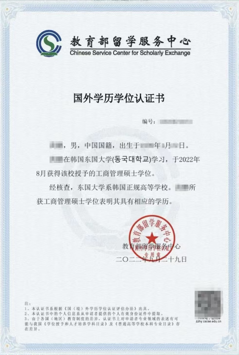 (东国大学教育部留学服务中心认证证书)